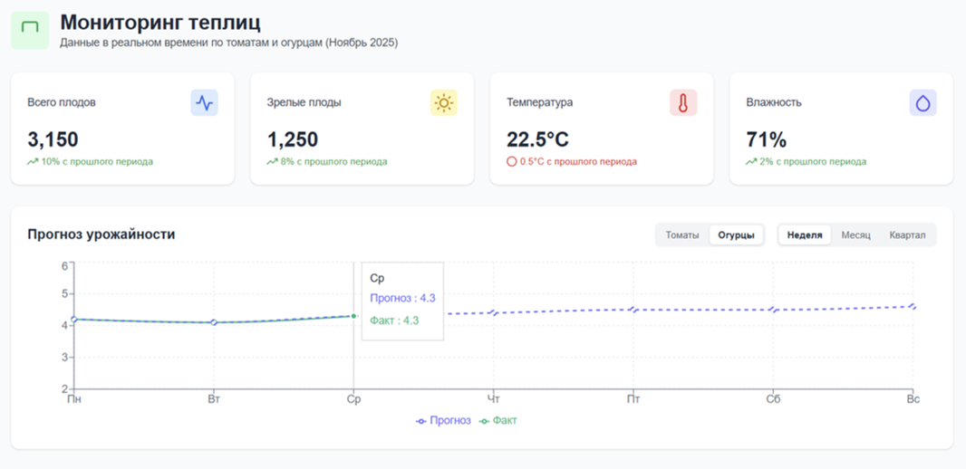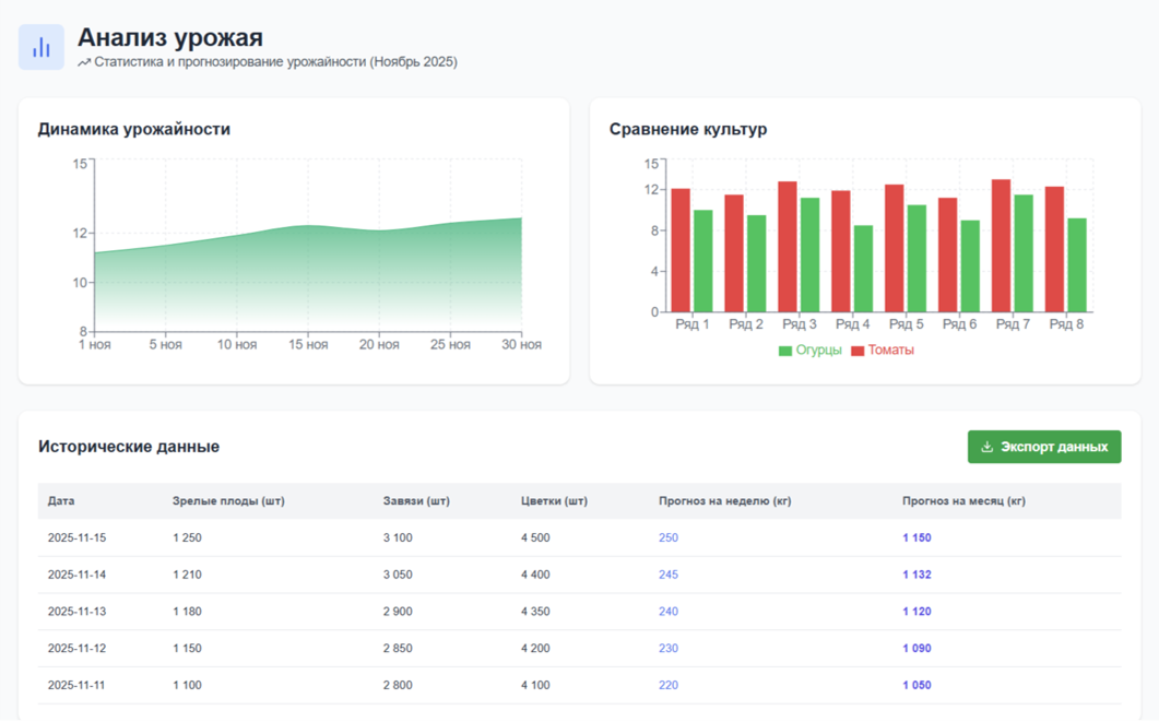 Предиктивные модели рассчитывают будущую массу урожая на основе текущих данных детекции и параметров микроклимата.