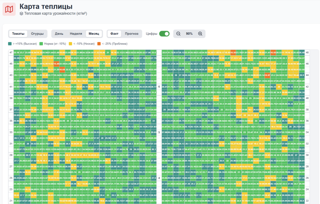 Построение тепловых карт урожайности теплицы для выявления проблемных зон и оптимизации логистики сбора.